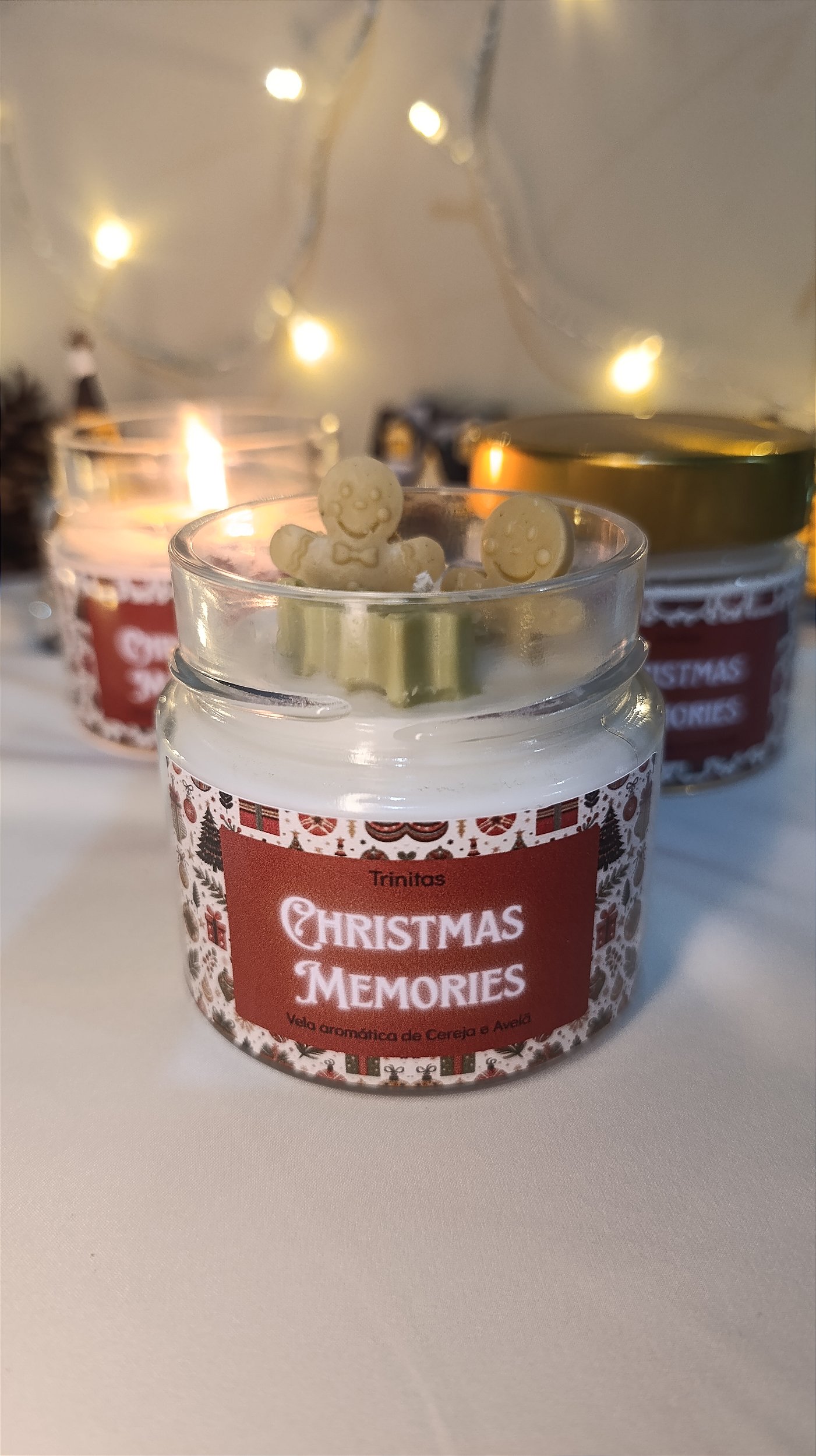 Produzida artesanalmente, esta vela de 180g recebe uma decoração encantadora com biscoitinhos natalinos e pequenos pinheiros, criando um visual festivo que transforma qualquer ambiente em um cenário mágico de Natal. É perfeita para decorar mesas, racks, aparadores ou para criar um clima especial em momentos de celebração.